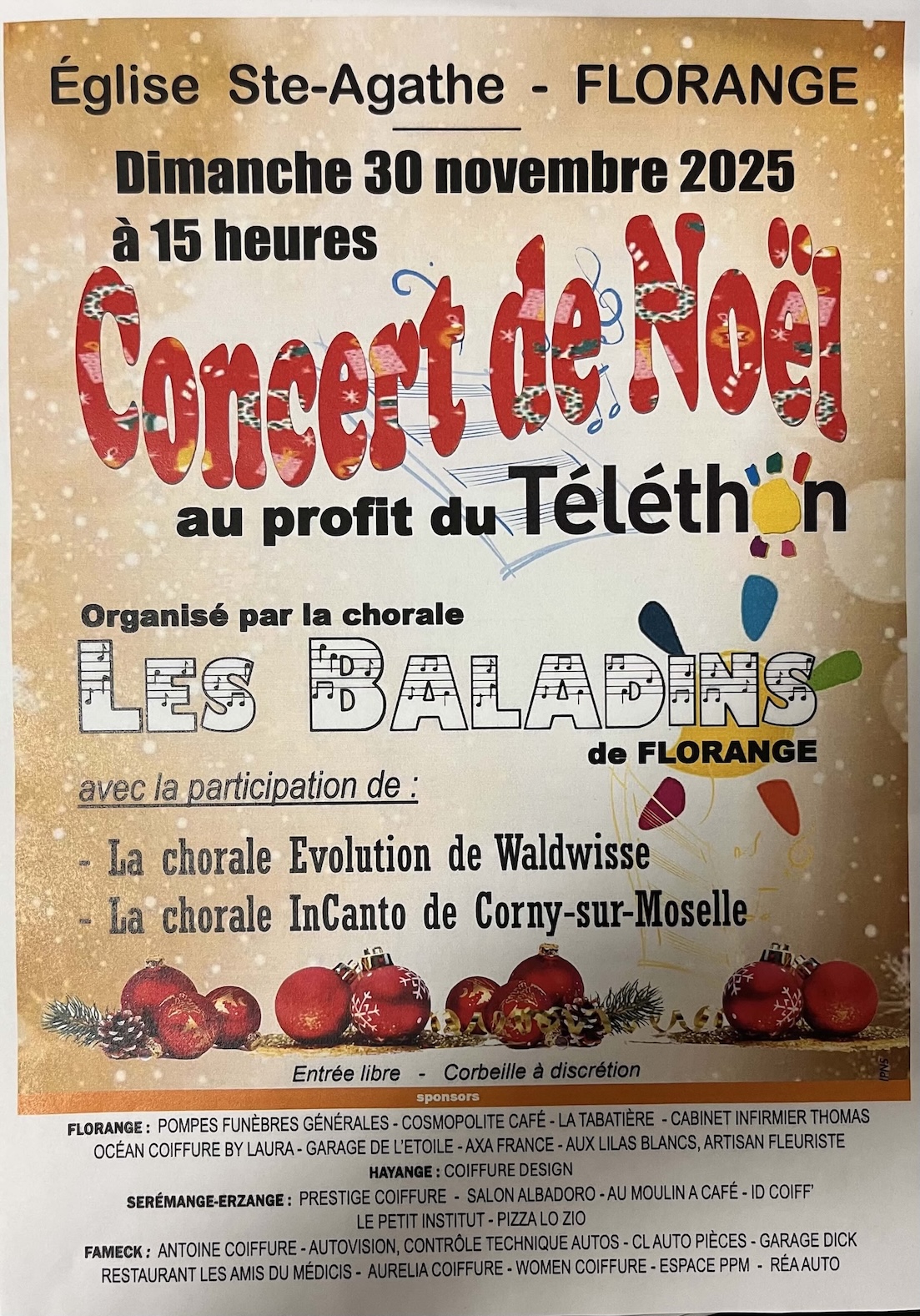 La chorale Les Baladins vous invite à partager un moment chaleureux et musical à l’occasion de son Concert de Noël, le dimanche 30 novembre 2025 à 15h, à l’église Sainte-Agathe de Florange. Sous la direction de leur chef de chœur, les choristes interpréteront un répertoire varié mêlant chants traditionnels, mélodies de Noël et harmonies festives pour plonger petits et grands dans la magie des fêtes.