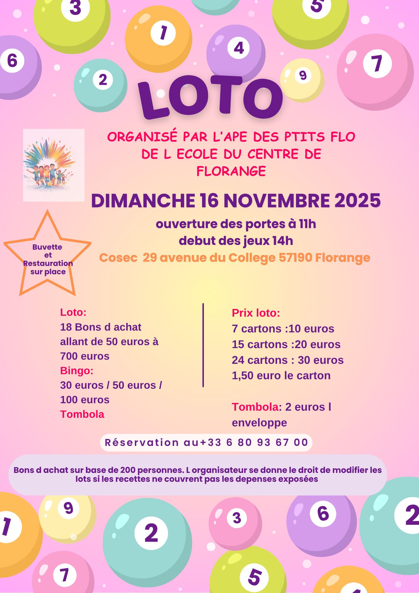 L’Association des Parents d’Élèves des Ptits Flo organise son grand loto le dimanche 16 novembre 2025 au COSEC – 29 avenue du Collège à Florange. Les portes ouvriront à 11h et les jeux débuteront à 14h. Au programme :